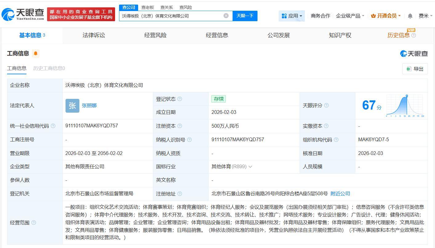 雷达财经讯,天眼查App显示,近日,沃得埃极(北京)体育文化有限公司成立,法定代表人为张照娜,注册资本500万人民币,经营范围包括组织文化艺术交流活动、体育赛事策划、体育竞赛组织、体育经纪人服务等,由IG电子竞技俱乐部关联公司上海埃极体育文化发展有限公司、特尼斯(海南)投资有限公司、沃得体育产业(北京)有限公司共同持股。公开资料显示,沃得体育产业(北京)有限公司曾作为世界乒乓球职业大联盟WTT系列赛事在中国大陆及澳门地区独家商事权利被许可人,中标“WTT球星挑战赛兰州站”项目。