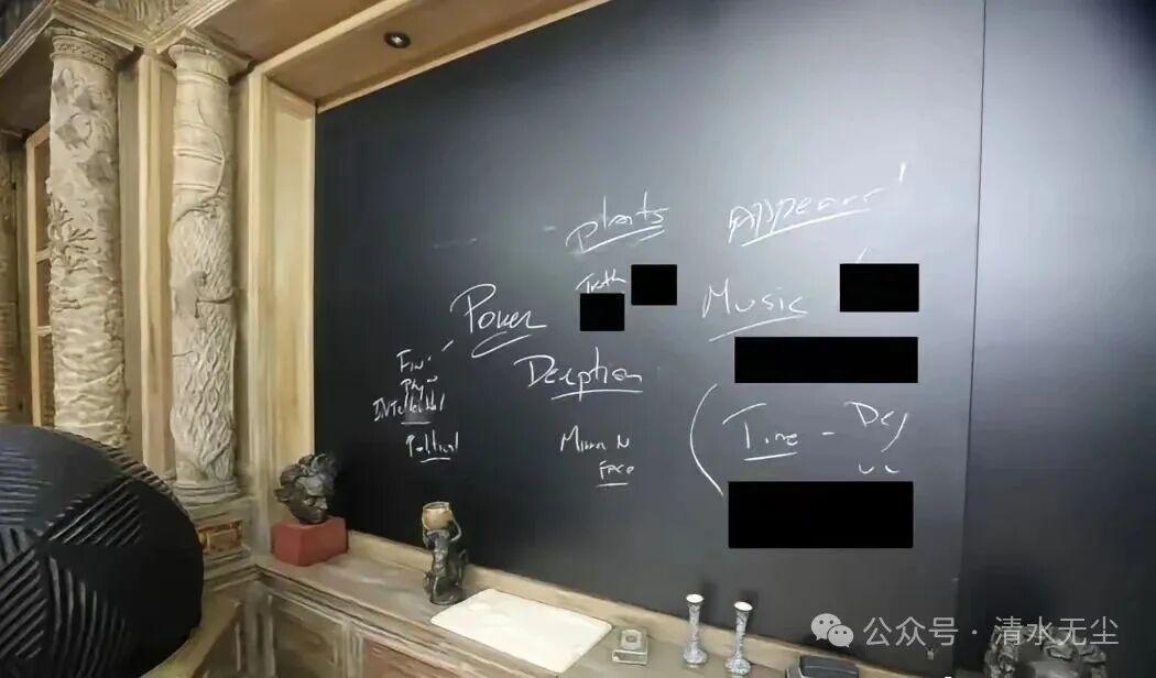 值得注意的是,一间房间里有一面墙的黑板,黑板上写着“欺骗”、“权力”、“真相”和“政治”等字眼,而其他一些字眼已被涂黑。
