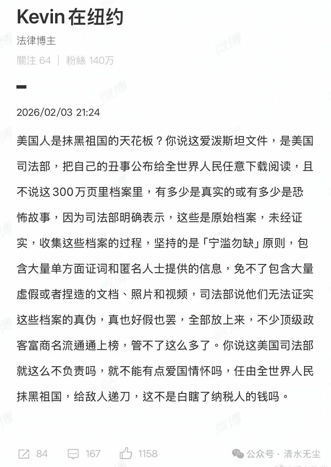 按照他的逻辑,是不是美国所有司法透明、自揭伤疤的行为都成了「美国人不爱国」?那爱泼斯坦案里被曝光的权贵名单、受害者血泪证词,是不是都该永远锁在保险柜里才叫美国人爱国,爱泼斯坦案的受害者是谁?是美国公民。